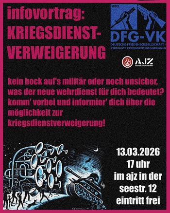 | Freitag, 13.03.2026 INFOVORTRAG KRIEGSDIENSTVERWEIGERUNGVortrag | Start: 17:00 h |